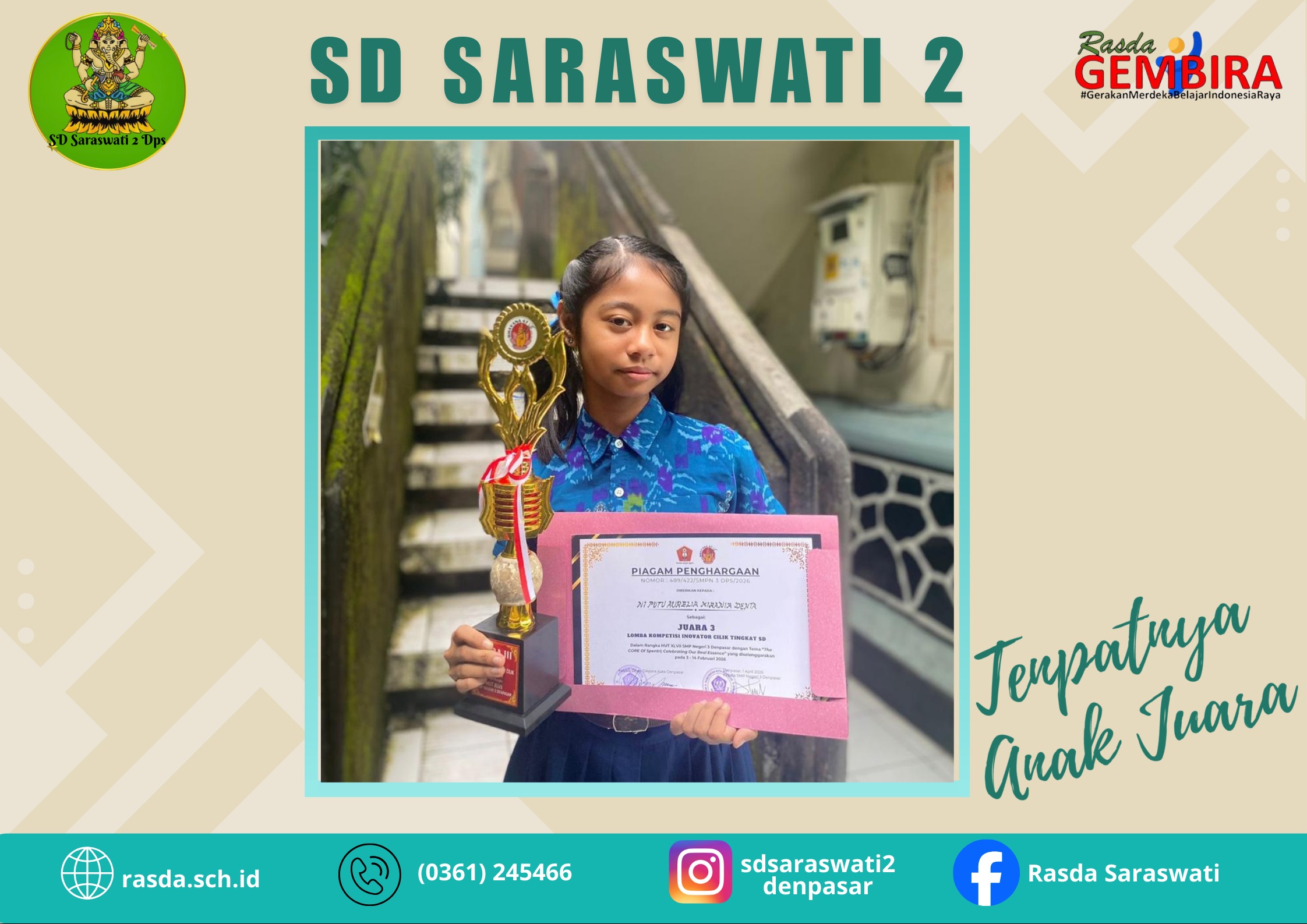 Ni Putu Aurelia Kirania Denta/ VI C. Juara 3 Lomba Kompetisi Inovator Cilik Tingkat SD Dalam Rangka HUT XLVII SMP Negeri 3...