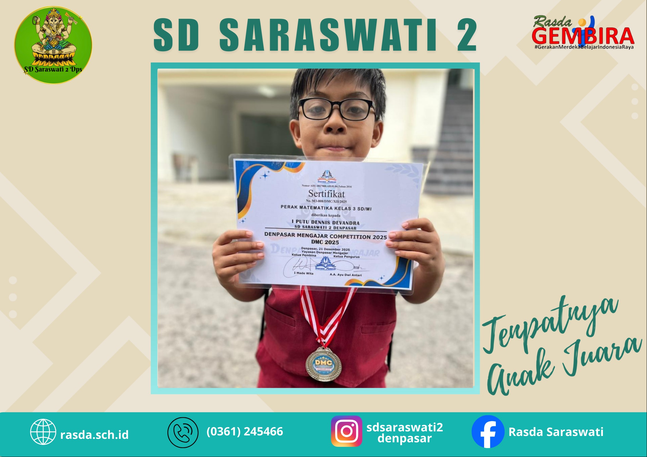 I Putu Dennis Devandra/ III B meraih Medali Perak Lomba Matematika Kelas 3 SD/MI yang diselenggarakan oleh Denpasar Mengajar...